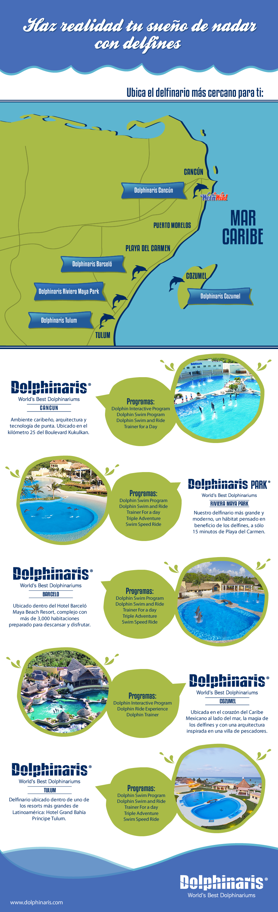 Nadar con delfines es un sueño que en Dolphinaris se puede convertir en una realidad. ¡Descubre los distintos delfinarios y programas que tenemos para ofrecerte y alístate para vivir la maravillosa experiencia de nadar con delfines.